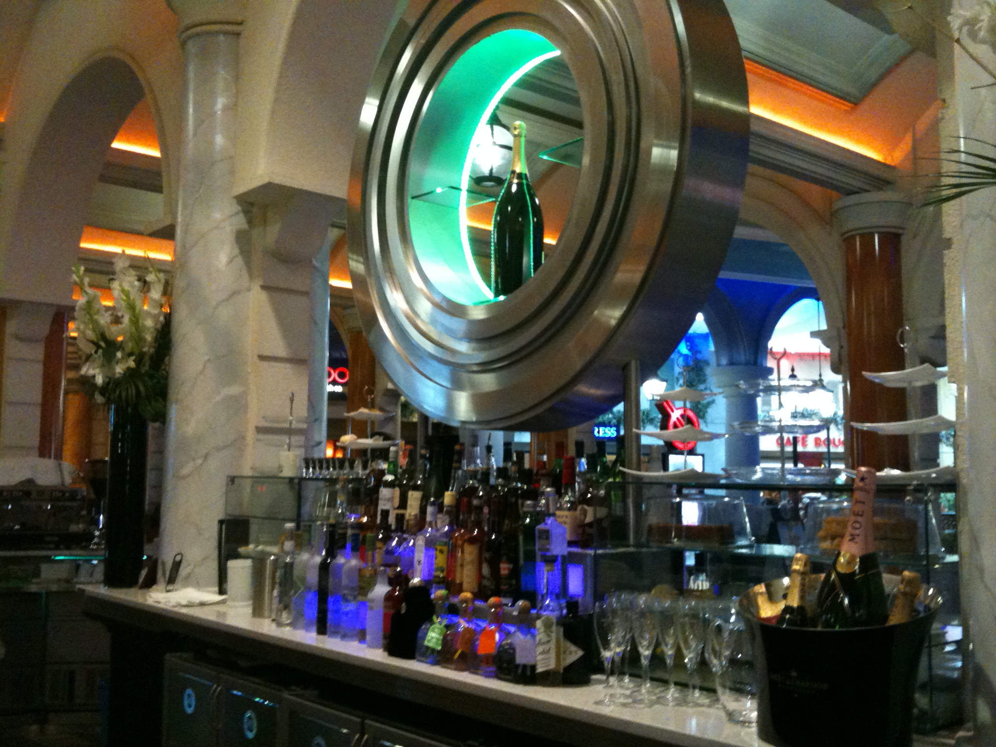 I took along a friend and arrived at about 3pm. As you can see the back bar automatically grabs your attention, the large circle with a magnum of champagne in the middle! A good layout of spirits surrounded underneath it including Jack Daniel Single Barrel, Belvedere, Patron and Martin Millers as well as display ice buckets with several bottles of Moet & Chandon poking out the top. Cake stands were also visible for there Afternoon Tea promotion (more about that later).