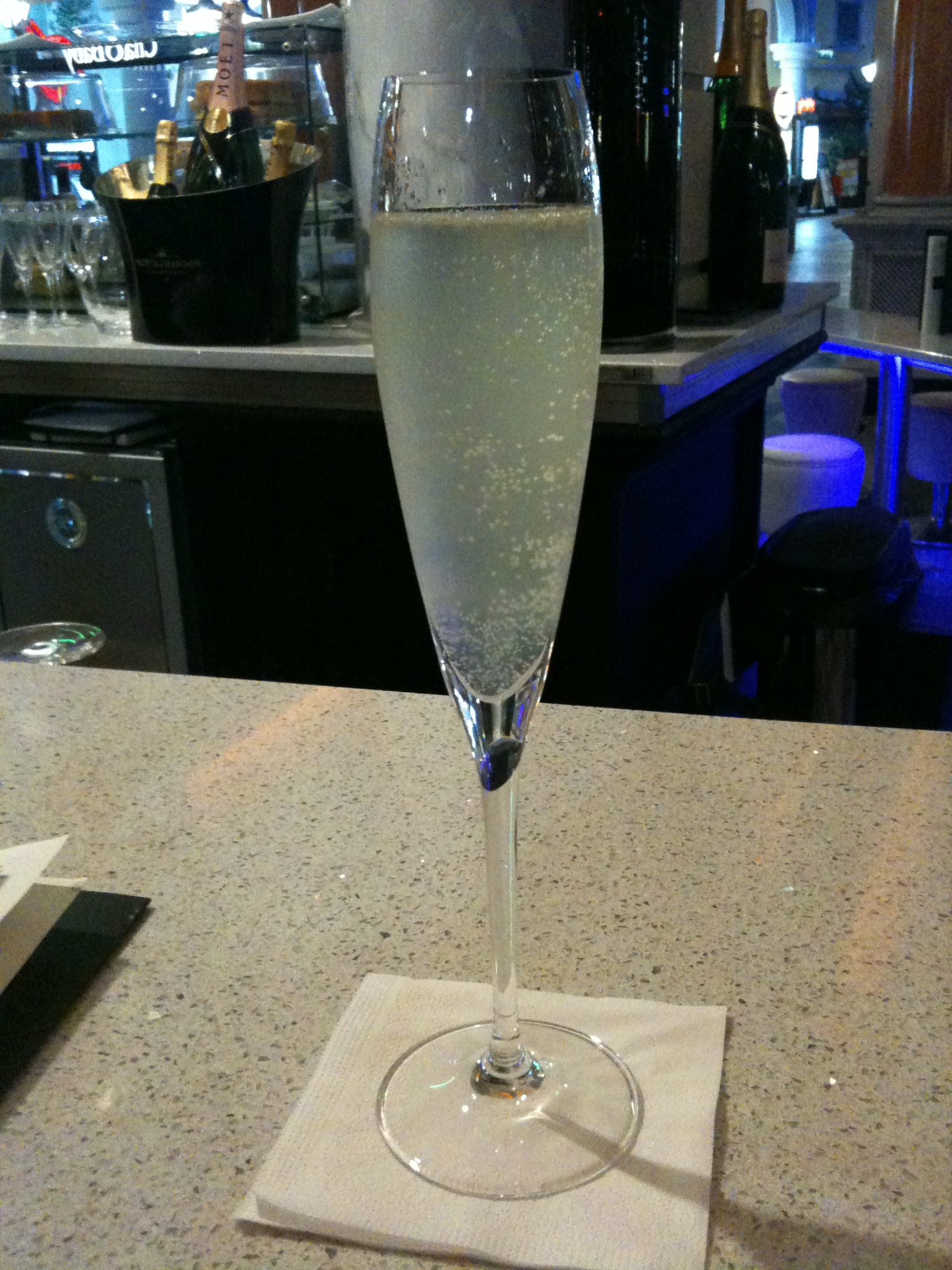 Sitting ourselves on white leather bar stools which despite looking like salon chairs, went surprisingly well with the white decor, we were greeted by the bartender on duty with a smile and a drinks menu. I had already previously asked The Circle Club (the company behind the bar) on there Twitter feed which cocktails they recommend with the replies of ‘Pornstar Martini and the speciality 360’, so with curiosity getting the better of me i plumped for the 360 while a French Martini was ordered as well. Now i don’t know if this is me but if you make a cocktail, you make it in front of the customer, not halfway down the bar. It would have been nice to see what ingredients he was putting in to this speciality cocktail (i glimpsed Hendricks gin being used) but i gave the man his dues once he presented me with the finished item.A dark blackcurrant colour with a fresh blackcurrant and cucumber fold as a garnish made a good first impression. It had a smooth velvety taste to it with the constant aroma of cucumber coming from both the garnish as well as the Hendricks gin. Slightly overpowering it sometimes but the blackberry taste counteracted it nicely and made it a very nice mouth-watering signature cocktail.We were a bit confused with what our other drink was as we originally ordered a French Martini however a champagne flute was handed to us which eventually turned out to be a French 75. Obviously thinking the French Martini would be served in the Martini glass and the signature cocktail served in a champagne flute, it turned out we were drinking the drink the other one had ordered. A mistake on the bartenders part but non-the-less the French 75 was a beautiful lemon zest cocktail with the Moet & Chandon champagne top not overpowering the overall complexity at all. After a few sips i also noticed it started to go down very smoothly, as if the drink had settled and it allowed you to enjoy it that little bit more. The glass itself helped, an elegant yet simple thinly stemmed champagne flute that curved at the top to reduce the amount of gasses being released.
