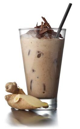 Add all ingredients to a cocktail shaker or blender. Close, shake or blend for 30 seconds, pour over ice cubes into a hi-ball glass and add crushed ice as a top layer. Garnish with wedge of cookie or with chocolate shavings and fresh ginger.