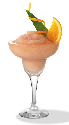 Blend and serve in a margarita glass. Garnish with a slice of orange.