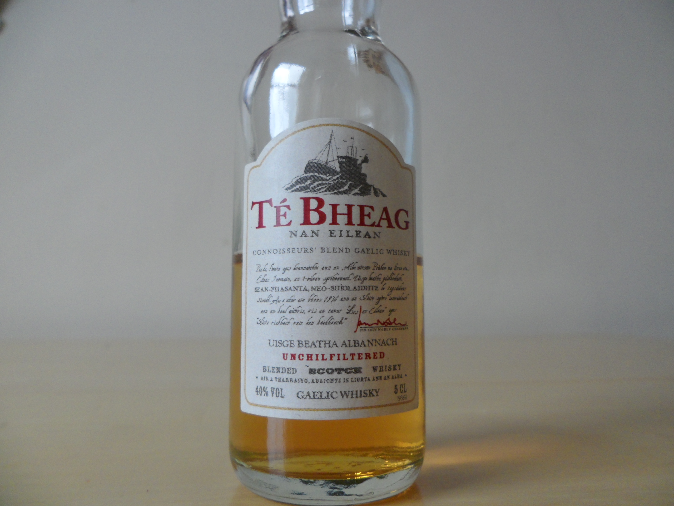 A friend of mine was given a small miniature of a Gaelic whisky named Té Bheag (40%), or ‘the little lady’, and I with a traditional name like that, I was intrigued to try it! A blended Scotch from the West Coast (with more than double the malt content of most standard blends), it contains mixes from Islay, Island, Highland and Speyside malts aged from 8 – 11 years.