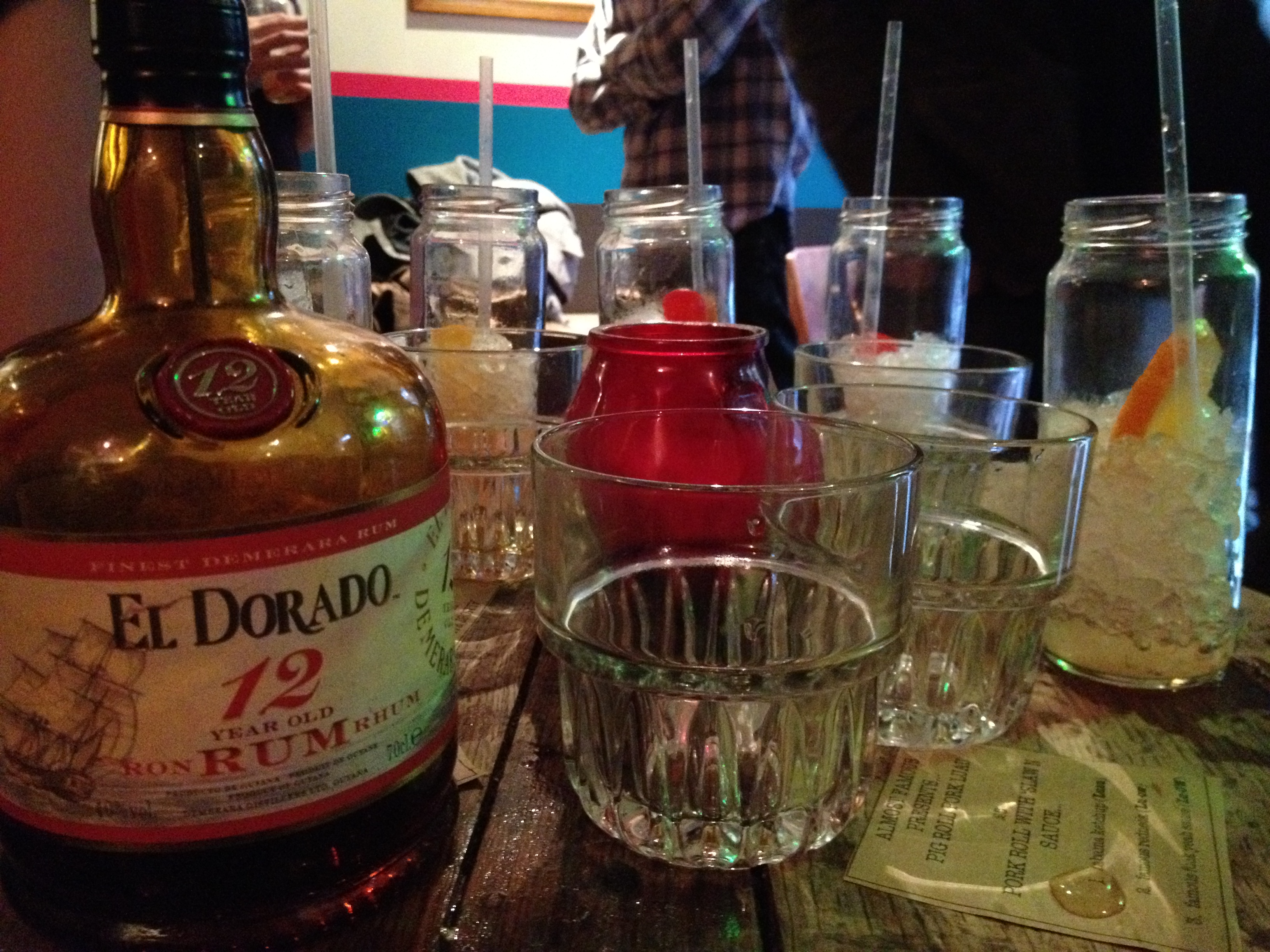 Tom, one of the founders of The Liquorists, had myself and eleven other food and drink fanatics meet at one of Manchester’s well-known Tiki bars, Hula. Located along Stevenson Square in the Northern Quarter, this basement den of cocktails rum and good cheer, complete with beach huts, sand and a tropical fish tank started our night off with Plantation rum. Part of a collection of unique Caribbean treasures, every barrel is individually sampled and only those that show traditional characteristics of the area of production are selected for bottling. This soft rum is aged in oak barrels for a number of years before being transported to cellars in Cognac, France where they are finished in Cognac casks. This well-balanced result was perfect for our cocktail creation, Atlantic Boat Club Daiquiri, and the fruits of banana and toasted pineapple. Next on the agenda was the short trip to Keko Moku, Manchester’s original Tiki bar. Huddled around wooden barrels with El Dorado 12yr being handed out, fire was being produced for a customers rum fuelled cocktail which does beg the question of ‘how is this place still standing?’. All is soon forgotten though with the Sanguine Swizzle cocktail which involves the Guyana based El Dorado 12yr and Blood Orange housed in a jam jar. Blended from different vintages, the age statement of the El Dorado works the same way as whisky produced in Scotland – it indicates the youngest rum in the blend, even though the oldest may be many years older.