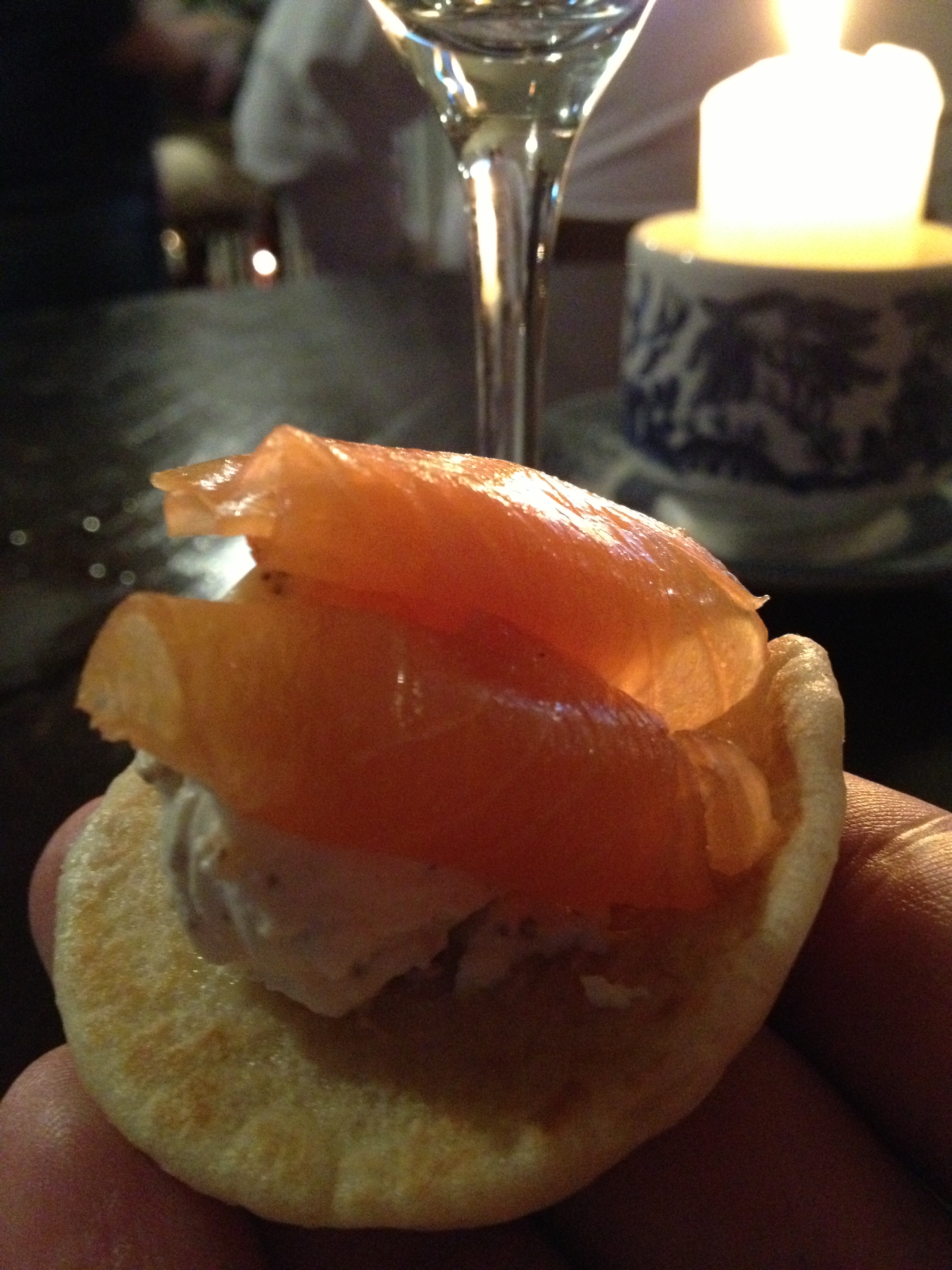 Enjoyed with Scottish smoked salmon, black pepper and cream cheese as well as a twist on the Vesper. Jody used Smoked vodka, Chase vodka and Williams gin, Taylor’s white port, orange bitters and the zest of a lemon to create a long, delicate drink that was very well-balanced.