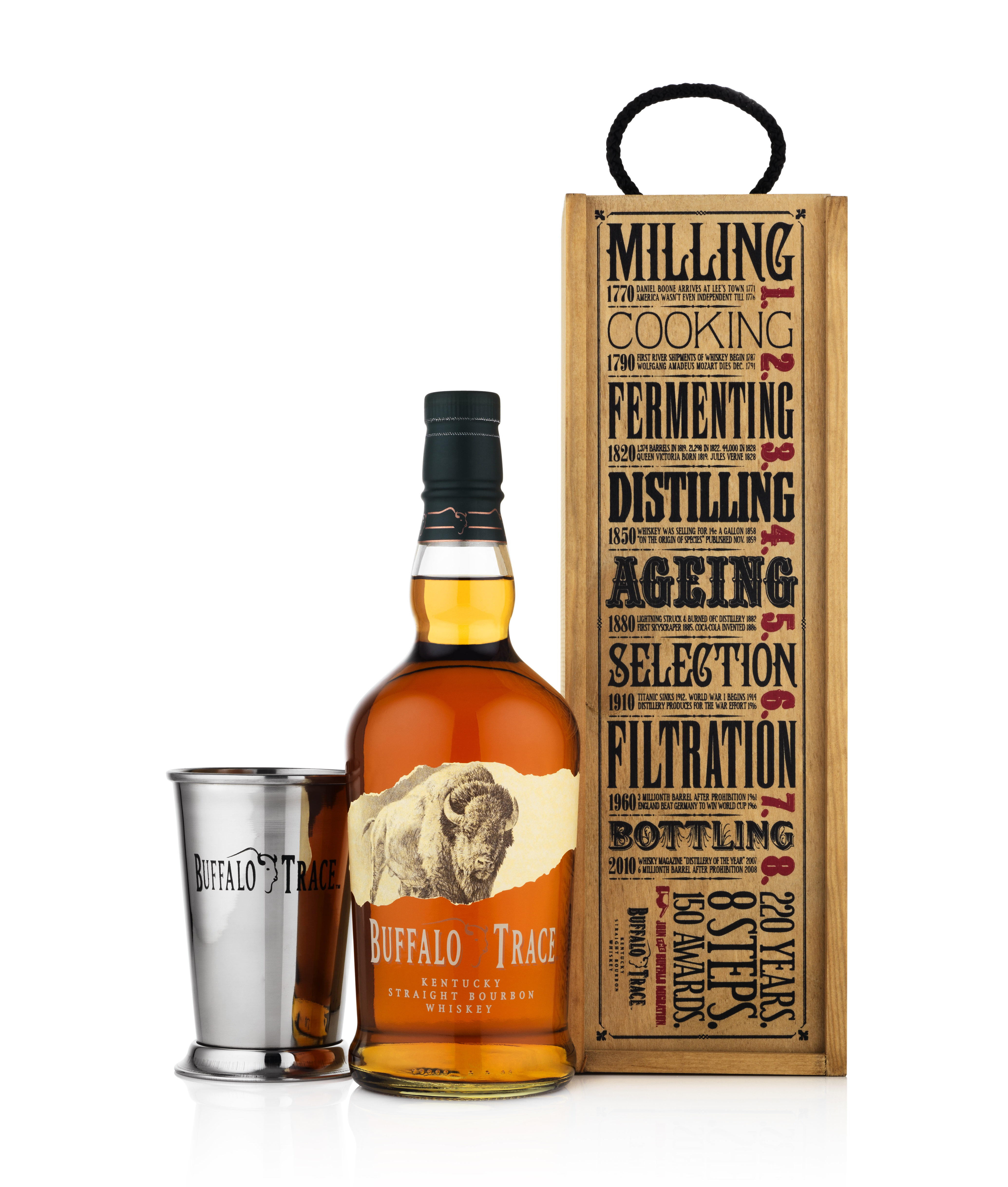 On the banks of the famous Kentucky River where the buffalo crossed on their ancient westward migratory route, Buffalo Trace is distilled, aged and bottled at the most award–‐winning distillery in the world. With only 70 sets in production, the Buffalo Trace Gift Box details the 8 steps, from milling to filtration, of the time–‐honoured craft unique to bourbon. Beginning with the finest Kentucky and Indiana corn, selected rye and superior malted barley, the Master Blender handpicks a small number of the best casks, maturing for 8-12 years in charred oak barrels, to create a blend of finely crafted small batch bourbon, Buffalo Trace. The classic stainless steel cup that sits handsomely alongside the Super–‐premium bourbonrepresents a traditional Kentucky cocktail, the Mint Julep that originated in the southern United States. The tasting profile of Buffalo Trace, with its signature aromas of vanilla, mint and molasses, perfectly complements the four key ingredients of the Mint Julep serve, mint leaves, bourbon, sugar and water.