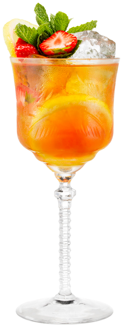 Build ingredients into an ice-filled wine glass. Garnish with a mint twig, orange and lemon slice.