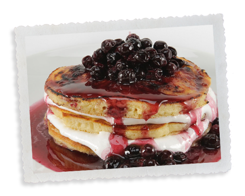 Top the pancake stack with the Bourbon Blueberry Compote and then drizzle generously with Naughty Syrup. Serve immediately!