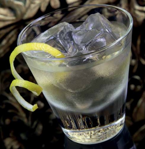 Stir all ingredients in a boston glass with ice, strain into a tumbler over cubed ice and snap fresh lemon zest.