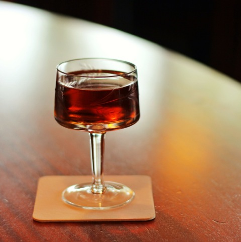Stir over ice and strain into a small chilled cocktail glass or coupe. Add the garnish so that each drop represents a point of a compass. Squeeze the twist over the drink, then discard.