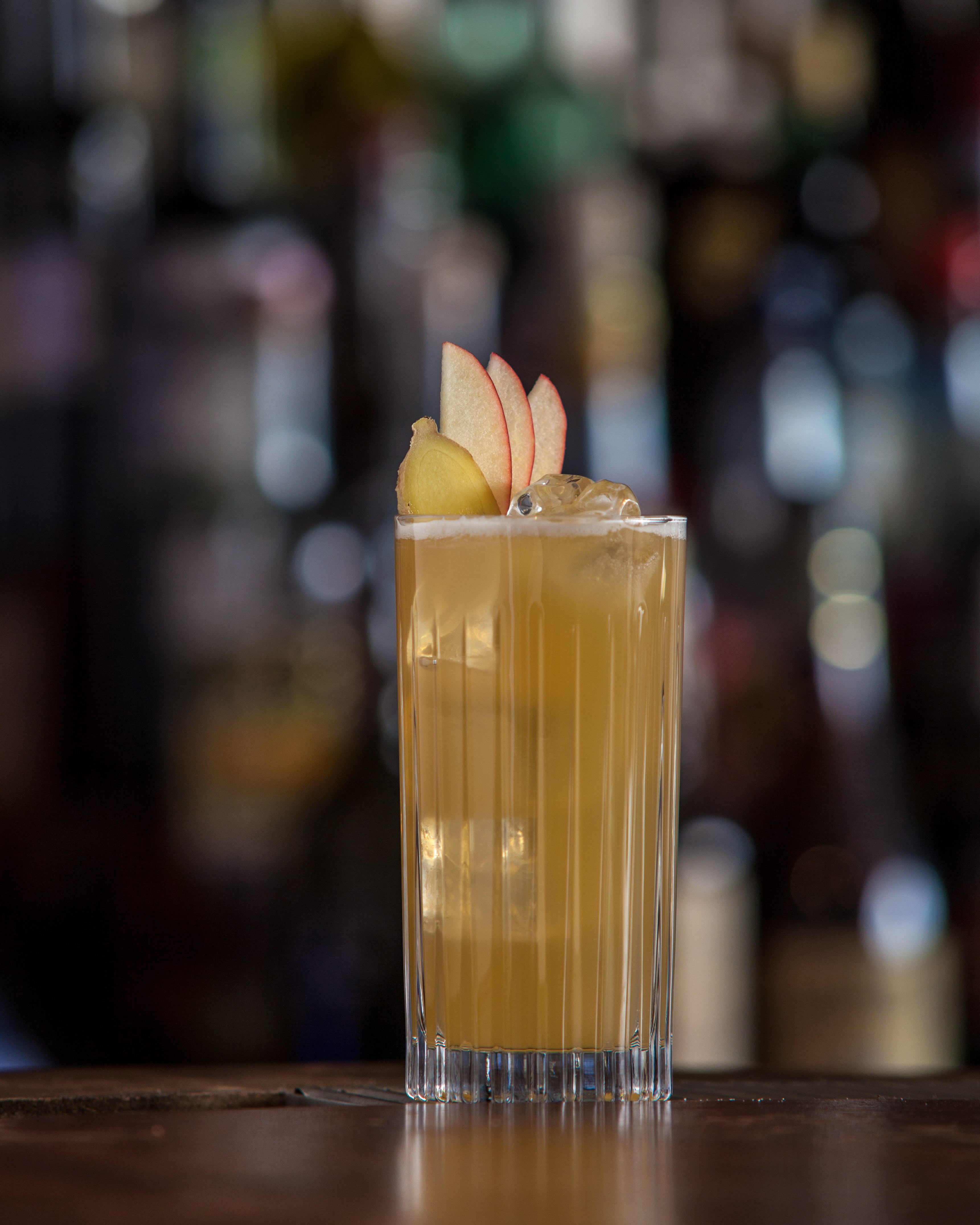 Muddle the ginger in the bottom of a cocktail shaker, add the other ingredients and shake with ice. Double strain into a tall glass filled with cubed ice. Garnish with apple slices and a slice of ginger