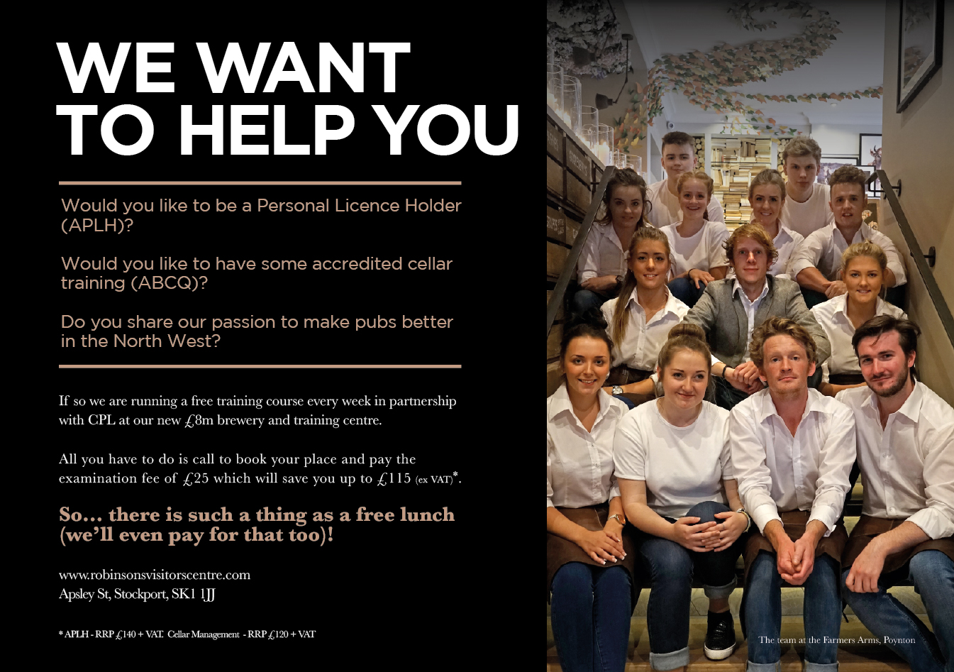 As part of their continual investment into skills training for pubs across the North West, Stockport brewer Robinsons are launching a series of free training courses to local publicans, existing hospitality staff or anyone looking to enter the hospitality industry. The only expense is an examination fee of £25 saving over £115 per person, per course (ex. Vat).*